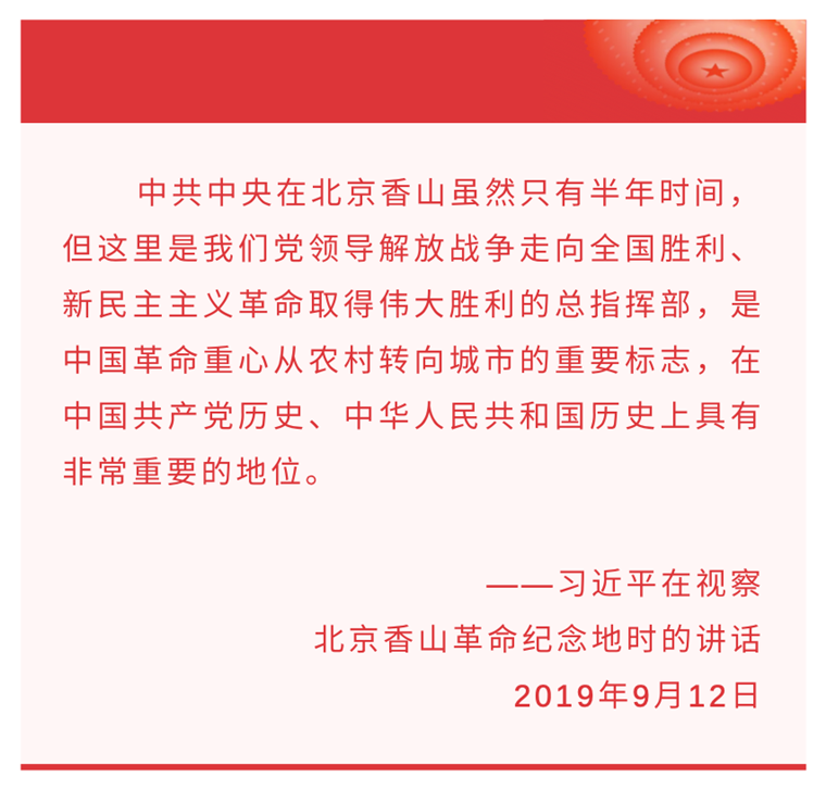 “鐘山風(fēng)雨起蒼黃,百萬(wàn)雄師過(guò)大江?!弊鳛橹袊?guó)革命勝利前夕黨中央所在地,巍巍香山目睹了毛澤東等老一輩革命家指點(diǎn)江山、揮斥方遒的豪情,也見(jiàn)證了中國(guó)共產(chǎn)黨人團(tuán)結(jié)各界人士凝心聚力描繪新中國(guó)宏偉藍(lán)圖的艱辛和榮耀。