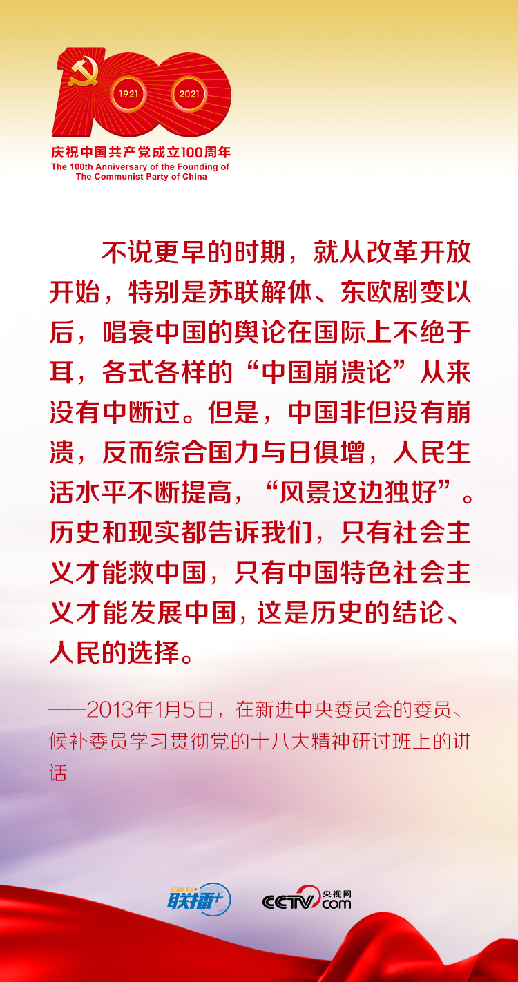 中國(guó)特色社會(huì)主義既堅(jiān)持了科學(xué)社會(huì)主義的基本原則,又根據(jù)時(shí)代條件不斷展現(xiàn)其鮮明的中國(guó)特色。黨的十八大以來(lái),習(xí)近平總書(shū)記在不同場(chǎng)合生動(dòng)回答了中國(guó)特色社會(huì)主義為什么好這個(gè)重大問(wèn)題。央視網(wǎng)《聯(lián)播+》特梳理總書(shū)記講話(huà)要點(diǎn),與您一起學(xué)習(xí)領(lǐng)悟走中國(guó)特色社會(huì)主義道路的正確性,堅(jiān)定走中國(guó)特色社會(huì)主義道路的信心與決心。