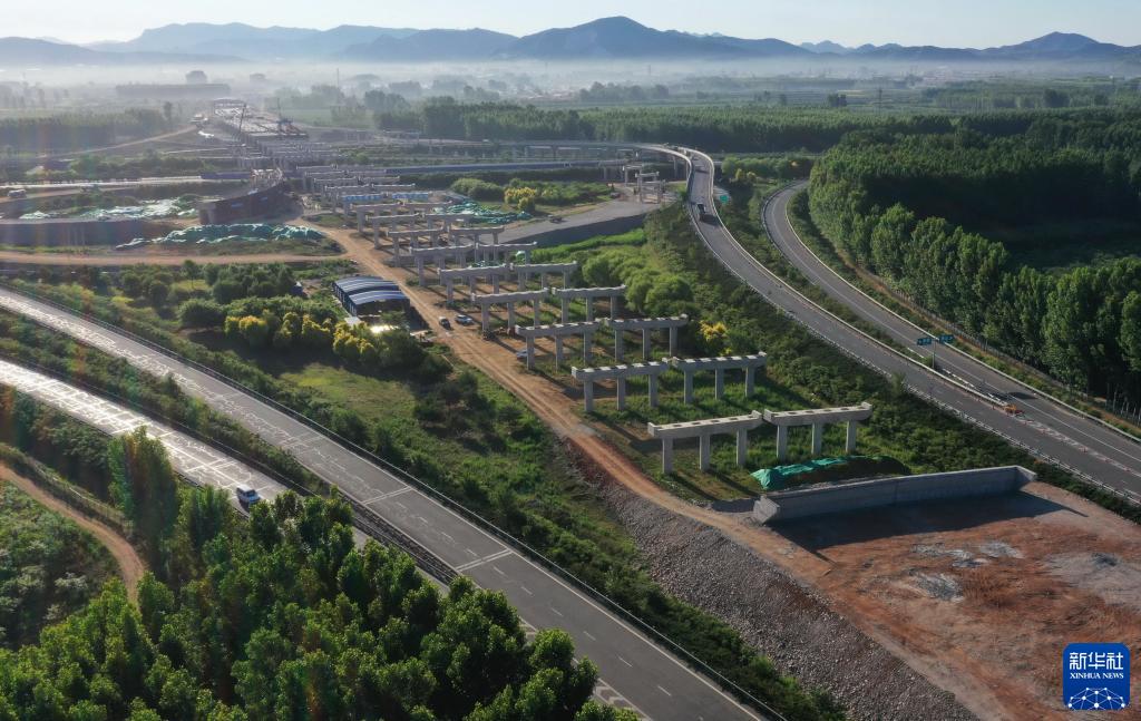 這是6月6日在遵化市境內(nèi)拍攝的京秦高速公路遵(遵化)秦(秦皇島)段與唐(唐山)承(承德)高速下院寺樞紐互通建設(shè)工地(無人機照片)。新華社記者 楊世堯 攝