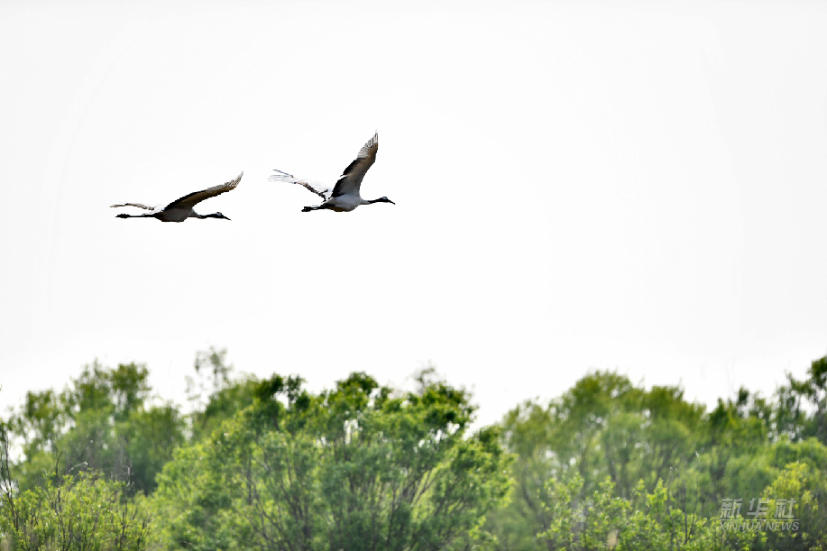 兩只丹頂鶴飛翔在自然保護區(qū)上空(2021年5月13日攝)。