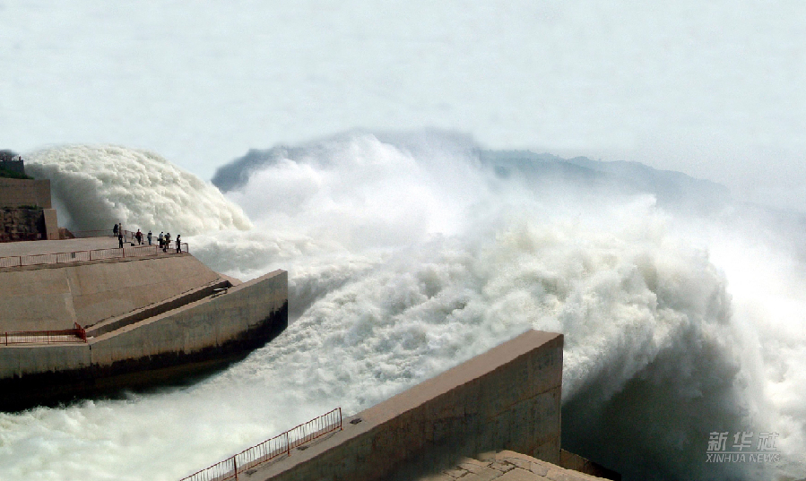 黃河小浪底水利樞紐工程開閘放水,調(diào)水調(diào)沙(2004年6月19日攝)。