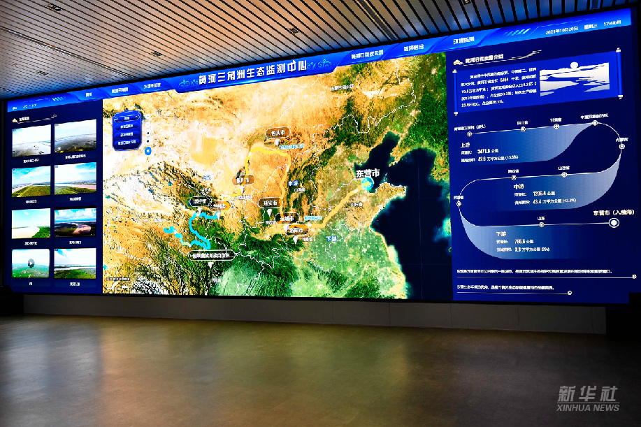 黃河三角洲生態(tài)監(jiān)測中心智慧大屏上顯示的保護區(qū)監(jiān)控畫面和相關(guān)數(shù)據(jù)(2021年10月20日攝)。