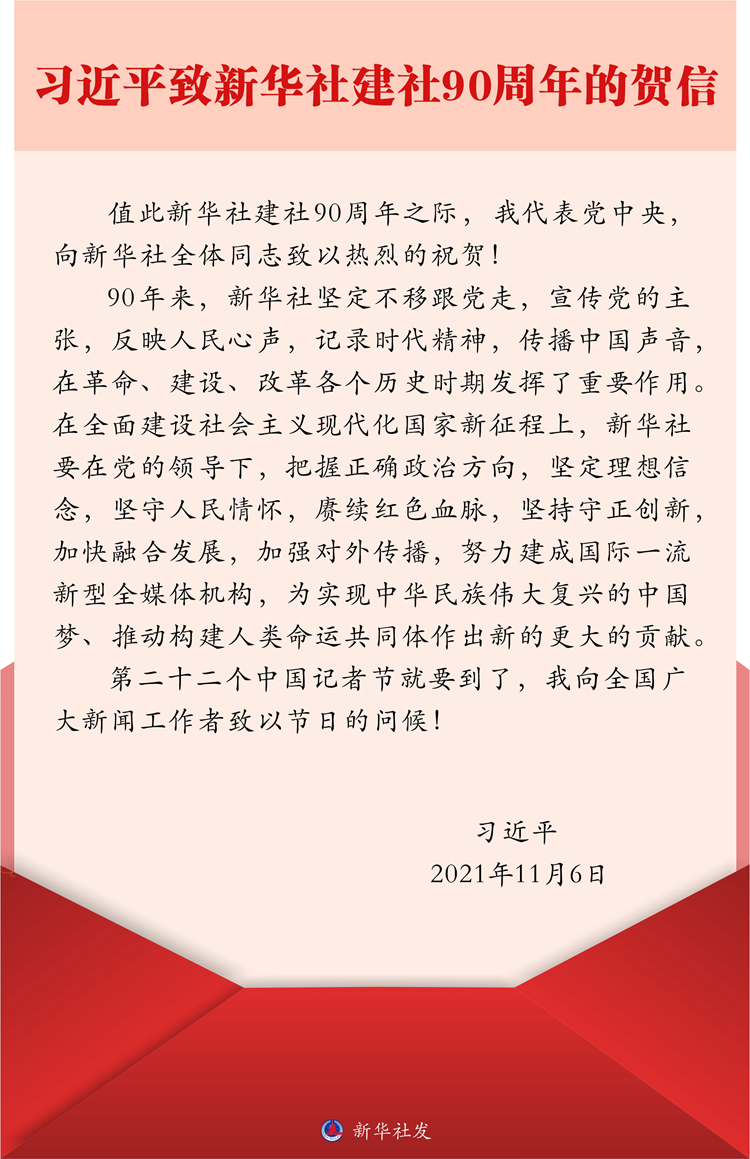 習近平在賀信中指出,90年來,新華社堅定不移跟黨走,宣傳黨的主張,反映人民心聲,記錄時代精神,傳播中國聲音,在革命、建設(shè)、改革各個歷史時期發(fā)揮了重要作用。
