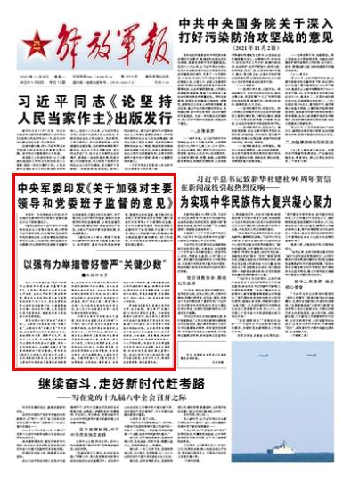 中央軍委印發(fā)《關(guān)于加強對主要領(lǐng)導和黨委班子監(jiān)督的意見》