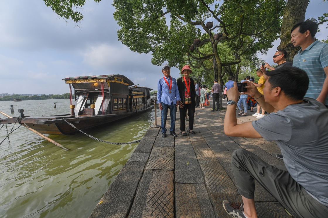 兩名老黨員在浙江嘉興南湖湖心島停泊的南湖紅船旁拍照(7月1日攝)。新華社記者 徐昱 攝