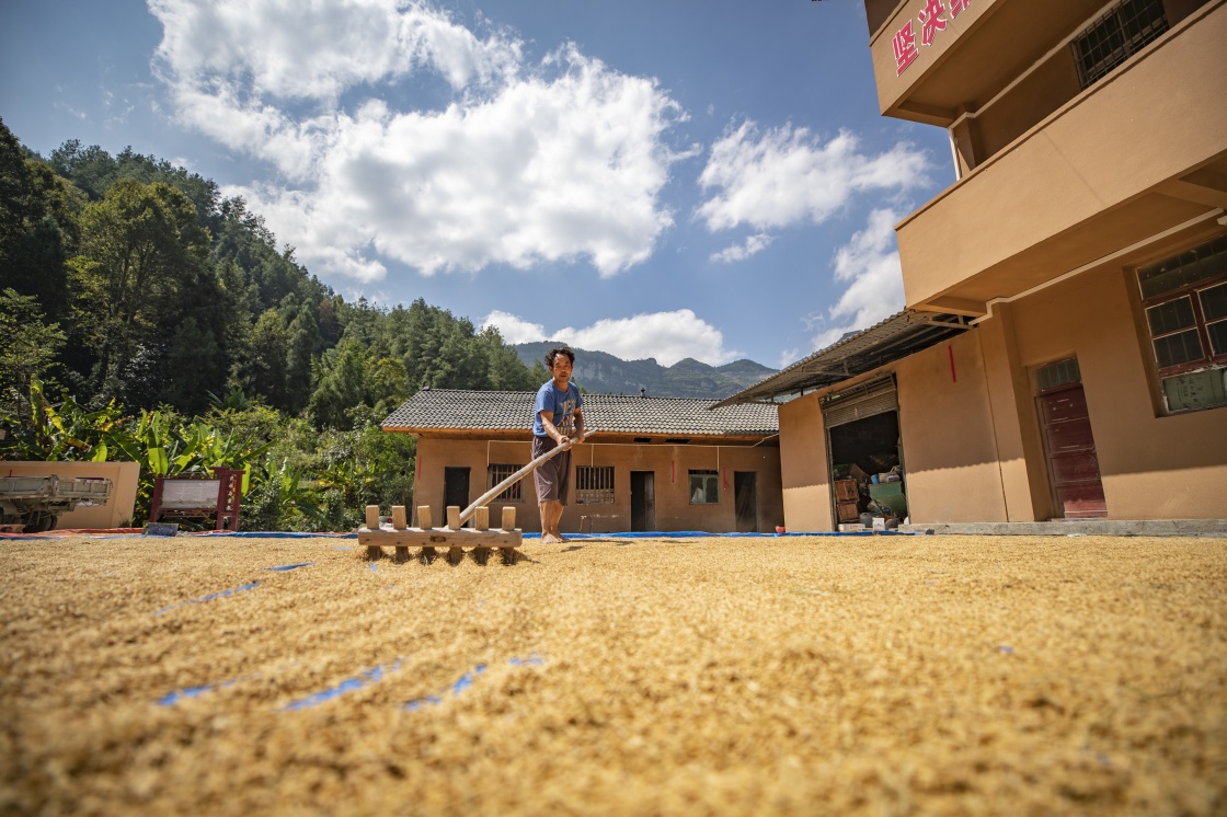 10月3日,重慶市酉陽土家族苗族自治縣花田鄉(xiāng)何家?guī)r村村民在晾曬水稻。新華社記者 黃偉 攝