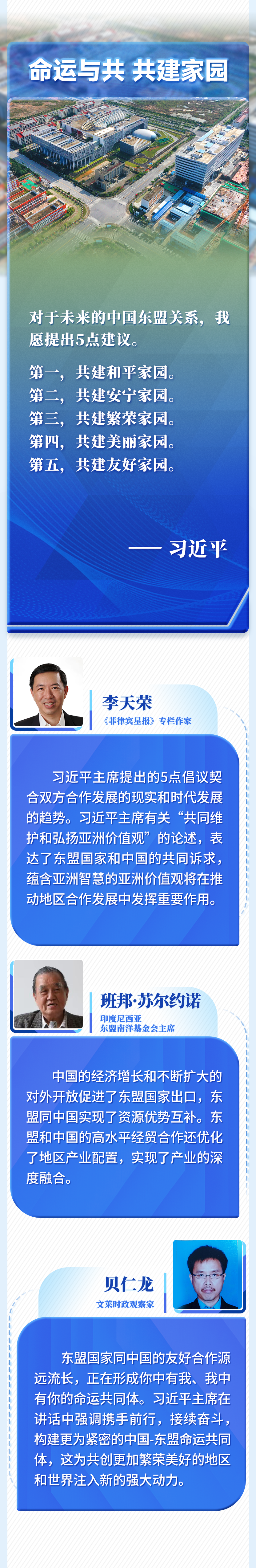 第一,共建和平家園。沒有和平,一切都無從談起。和平是我們最大的共同利益,也是各國人民最大的共同期盼。我們要做地區(qū)和平的建設(shè)者和守護者,堅持對話不對抗、結(jié)伴不結(jié)盟,攜手應(yīng)對威脅破壞和平的各種負面因素。我們要踐行真正的多邊主義,堅持國際和地區(qū)的事大家商量著辦。中方堅決反對霸權(quán)主義和強權(quán)政治,愿同周邊鄰國長期友好相處,共同維護地區(qū)持久和平,絕不尋求霸權(quán),更不會以大欺小。中方支持東盟建設(shè)無核武器區(qū)的努力,愿盡早簽署《東南亞無核武器區(qū)條約》議定書。