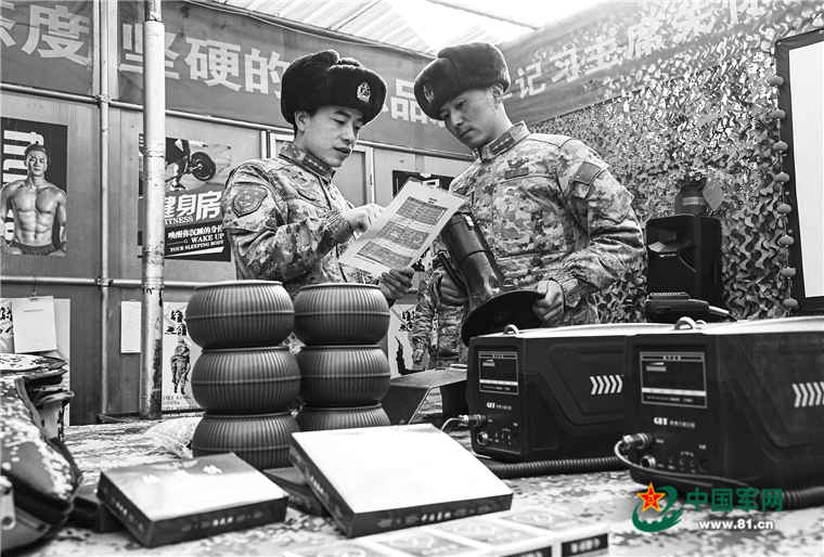第76集團(tuán)軍某旅偵察科參謀蔡欣(左)為基層發(fā)放訓(xùn)練器材,解決基層組訓(xùn)難題。王雲(yún)嶠攝