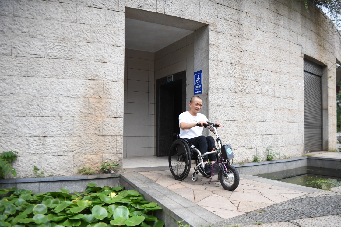 在湖南省長沙市湘府文化公園,劉毅坐電動輪椅車從無障礙洗手間出來(2021年8月25日攝)。新華社記者 薛宇舸 攝