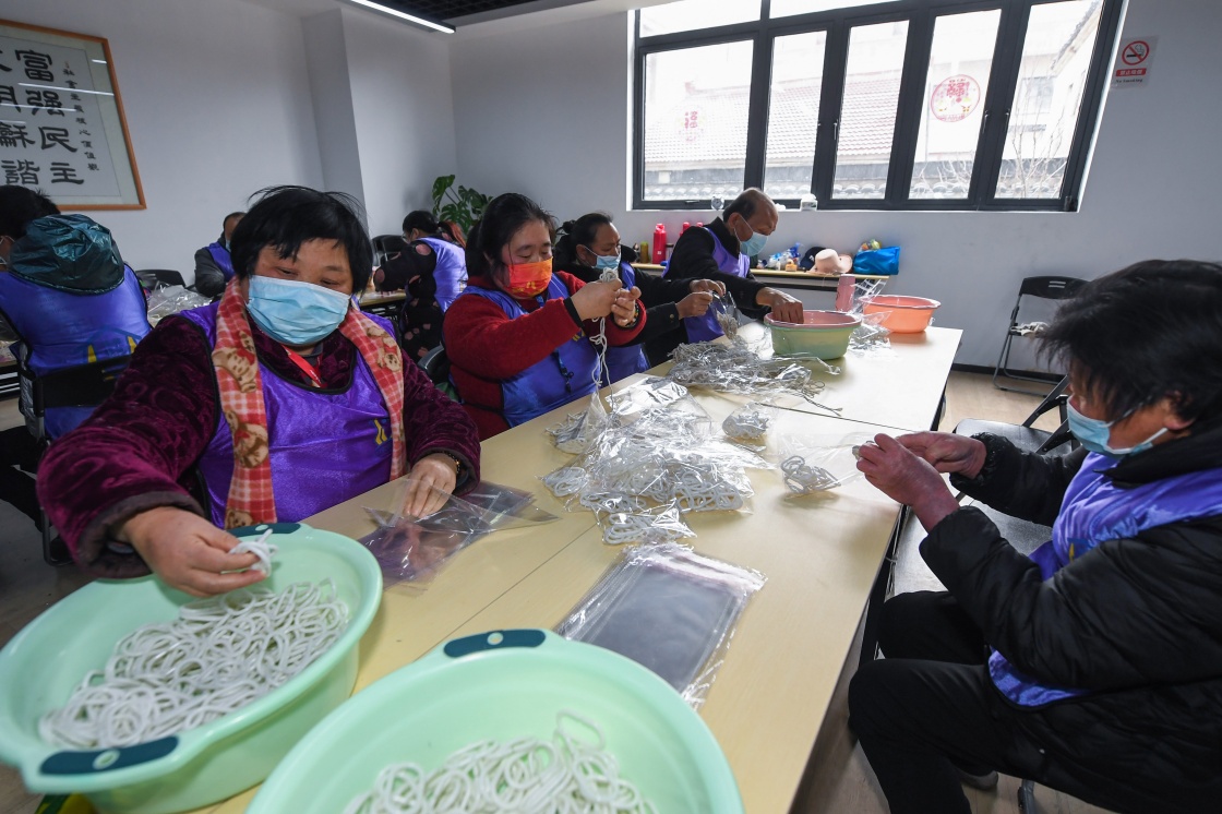 在浙江湖州市織里鎮(zhèn)港西村殘疾人之家,來自周邊的殘疾人正在打包配件(2022年2月22日攝)。完成工作后,他們可以獲得相應報酬和補貼。新華社記者 徐昱 攝