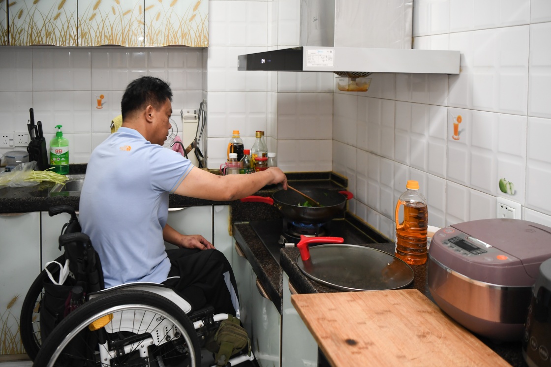 湖南省長沙市天心區(qū)家中,徐經卓在定制低位灶臺上炒菜(2021年8月25日攝)。新華社記者 薛宇舸 攝