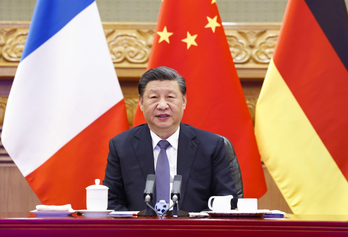 3月8日下午,國家主席習近平在北京同法國總統(tǒng)馬克龍、德國總理朔爾茨舉行視頻峰會。新華社記者 李響 攝