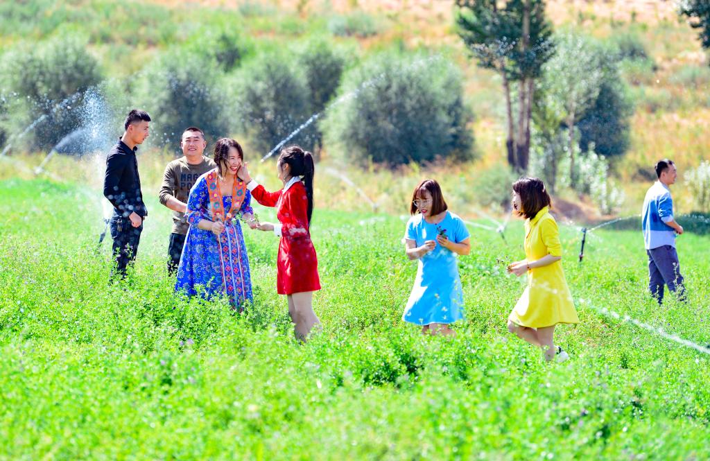 2021年9月14日,游客在鄂爾多斯市伊金霍洛旗納林陶亥鎮(zhèn)一個采煤沉陷區(qū)通過生態(tài)修復(fù)建成的景區(qū)內(nèi)游玩。新華社發(fā)(王正攝)