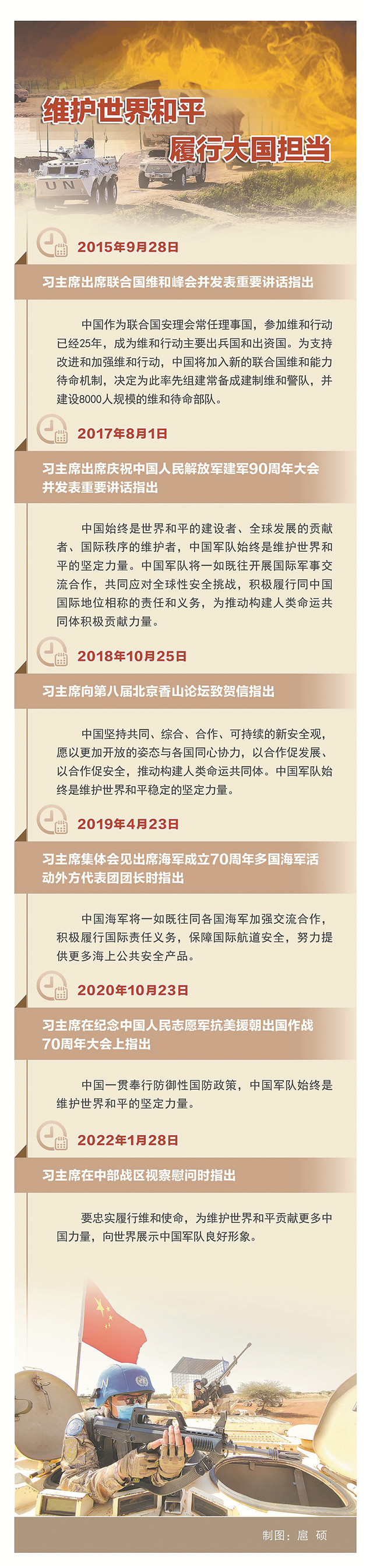 “要忠實履行維和使命,為維護世界和平貢獻更多中國力量,向世界展示中國軍隊良好形象?!?月28日,習主席同中部戰(zhàn)區(qū)海外維和分隊進行視頻通話時,向我軍正在海外執(zhí)行任務的全體官兵表示慰問并提出殷切希望。