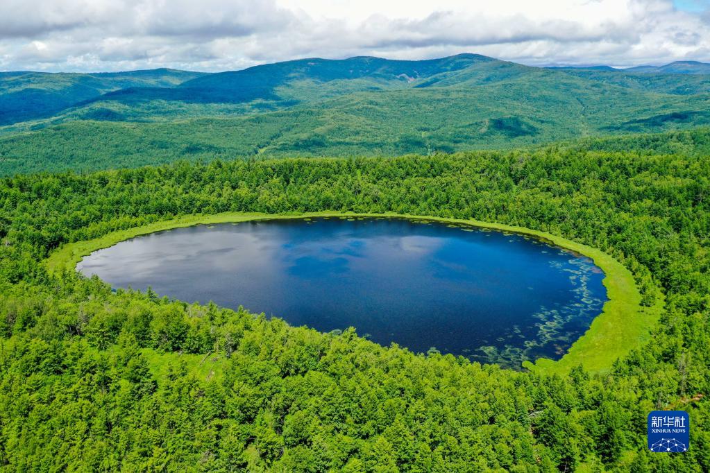 這是內(nèi)蒙古阿爾山國家森林公園內(nèi)的天池(2021年7月14日攝,無人機(jī)照片)。新華社記者 連振 攝