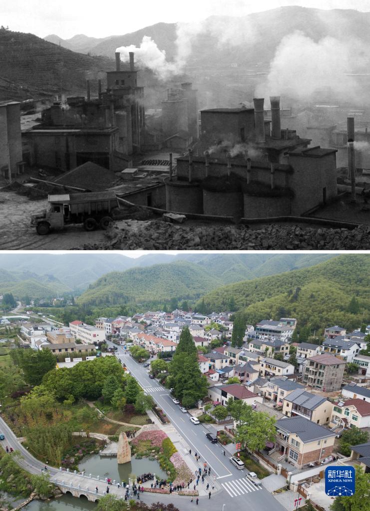 拼版照片:上圖為浙江省湖州市安吉縣天荒坪鎮(zhèn)余村二十世紀(jì)八十年代的資料照片;下圖為2018年4月24日,游客在整修一新的余村游覽(新華社記者翁忻旸攝)。新華社