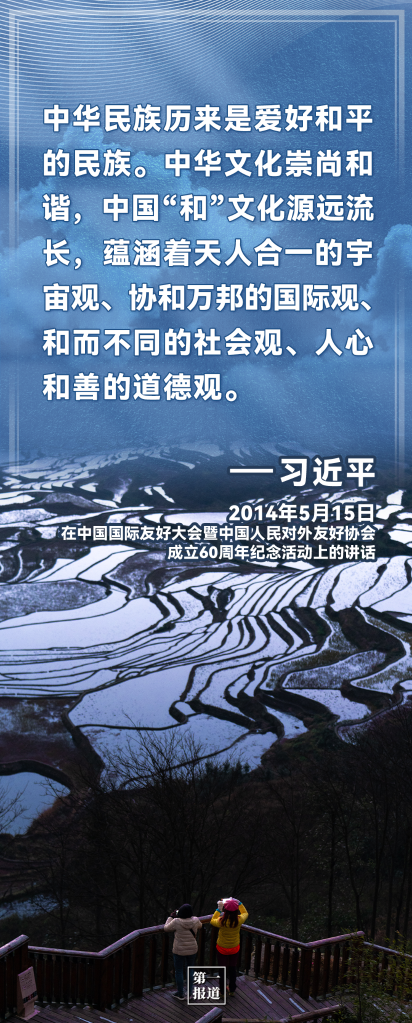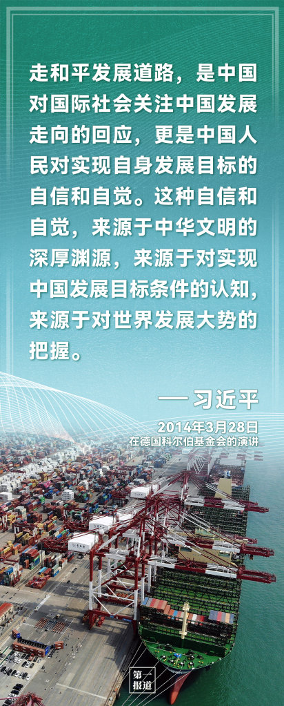 中國(guó)走和平發(fā)展道路,不是權(quán)宜之計(jì),更不是外交辭令,而是從歷史、現(xiàn)實(shí)、未來的客觀判斷中得出的結(jié)論,是思想自信和實(shí)踐自覺的有機(jī)統(tǒng)一。進(jìn)入新時(shí)代以來,習(xí)近平在多個(gè)場(chǎng)合,這樣闡述——