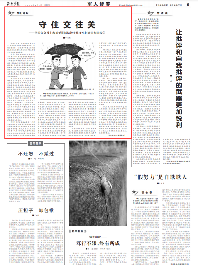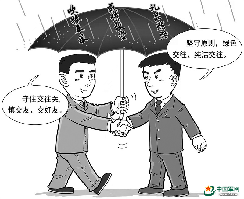 在交往中,還要強化紀(jì)律觀念、樹立底線思維,給自己裝上“防火墻”“過濾網(wǎng)”,牢牢守住交往關(guān),守住自己的政治生命線。尤其是對軍隊黨員干部而言,要形成有凝聚力和戰(zhàn)斗力的鋼鐵集體,更要守好交往關(guān)。要把習(xí)主席重要講話精神落實到清清爽爽交往、清清白白做人、干干凈凈做事上,強化身份意識,純潔社會交往,步子多往基層邁,多和官兵交朋友,帶頭構(gòu)建風(fēng)清氣正、和諧融洽、團結(jié)共進(jìn)的內(nèi)部關(guān)系,與官兵同心協(xié)力、心無旁騖地投身主責(zé)主業(yè),推進(jìn)強軍事業(yè)。
