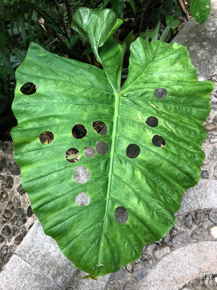 △海芋,屬天南星科,海芋葉片上的許多小洞是被一種叫錨阿波螢葉甲的小昆蟲造成的,海芋的汁液有毒,而錨阿波螢葉甲是專食性昆蟲,想要吃到美味的食物又不被毒死,只能先將葉片的葉脈咬斷,把毒素排出再吃。(總臺央視記者石偉明拍攝)