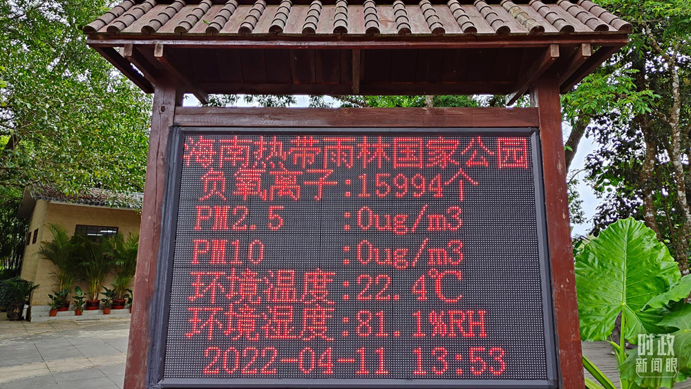△海南熱帶雨林國家公園的電子屏顯示實(shí)時(shí)環(huán)境質(zhì)量指數(shù)。(總臺央視記者楊立峰拍攝)
