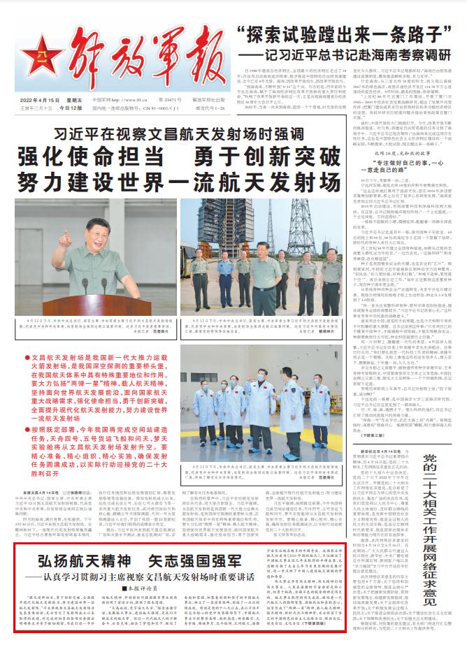 “強化使命擔(dān)當(dāng),勇于創(chuàng)新突破,全面提升現(xiàn)代化航天發(fā)射能力,努力建設(shè)世界一流航天發(fā)射場?!绷?xí)主席視察文昌航天發(fā)射場并發(fā)表重要講話,充分肯定了發(fā)射場成立以來取得的成績,對完成好擔(dān)負(fù)的各項任務(wù)提出明確要求并寄予殷切期望,為我們進(jìn)一步弘揚航天精神、開創(chuàng)新時代強國強軍事業(yè)新局面指明了前進(jìn)方向,提供了根本遵循。