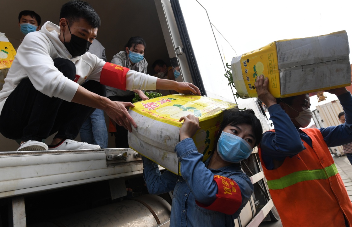 2020年3月3日,在廣西南寧國際鐵路港,南寧車務(wù)段“青年突擊隊”隊員黃瑩瑩(右二)在搬運廣西馳援湖北物資。新華社記者 陸波岸 攝