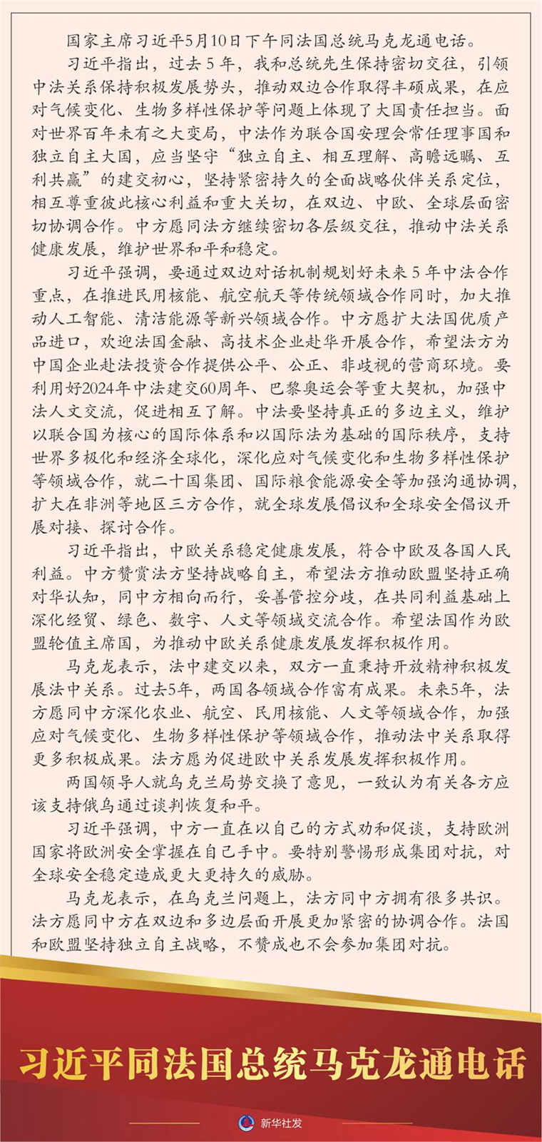 新華社北京5月10日電? 國家主席習(xí)近平5月10日下午同法國總統(tǒng)馬克龍通電話。