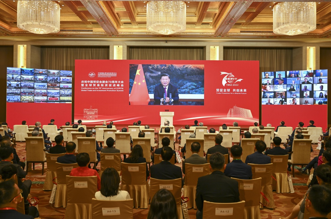 5月18日,國家主席習(xí)近平在慶祝中國國際貿(mào)易促進委員會建會70周年大會暨全球貿(mào)易投資促進峰會上發(fā)表視頻致辭。新華社記者 殷博古 攝