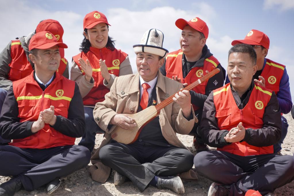 牧民阿布都加帕爾·猛德(中)和當(dāng)?shù)攸h員干部一道過主題黨日活動(dòng)(2022年4月16日攝)。新華社發(fā)(艾買提江·艾則木 攝)