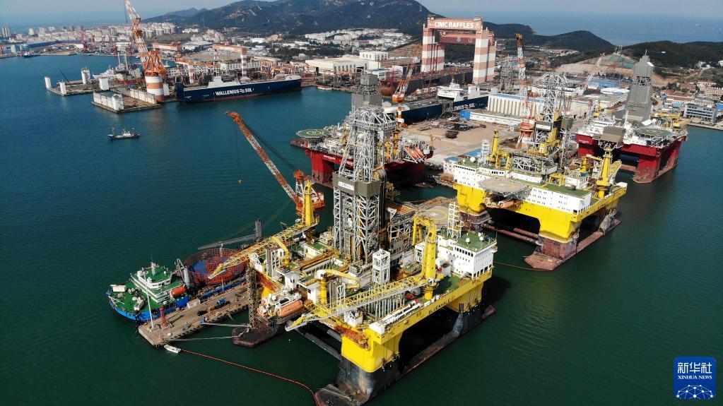 “藍(lán)鯨1號(hào)”(前右)及姊妹平臺(tái)“藍(lán)鯨2號(hào)”(前左)在其生產(chǎn)基地中集來福士海洋工程有限公司煙臺(tái)基地進(jìn)行維護(hù)和保養(yǎng)(2021年10月18日攝,無人機(jī)照片)。新華社記者李紫恒攝