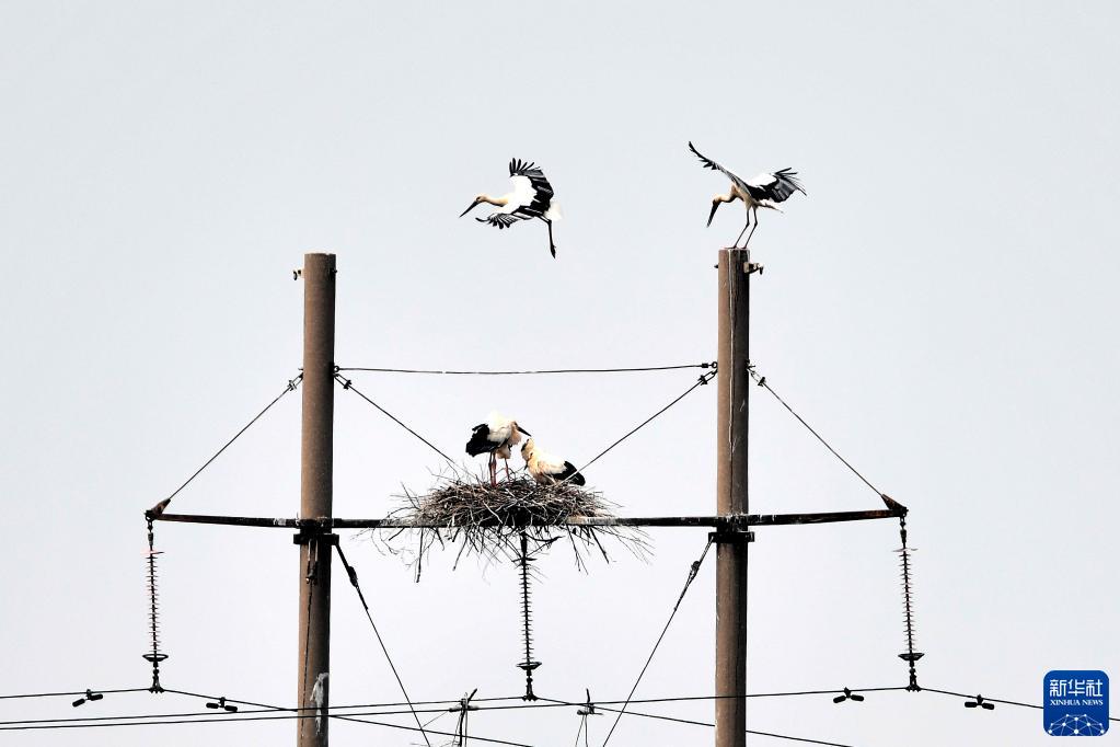 這是山東黃河三角洲國家級(jí)自然保護(hù)區(qū)電線桿上的東方白鸛的巢(2021年5月13日攝)。新華社記者郭緒雷攝