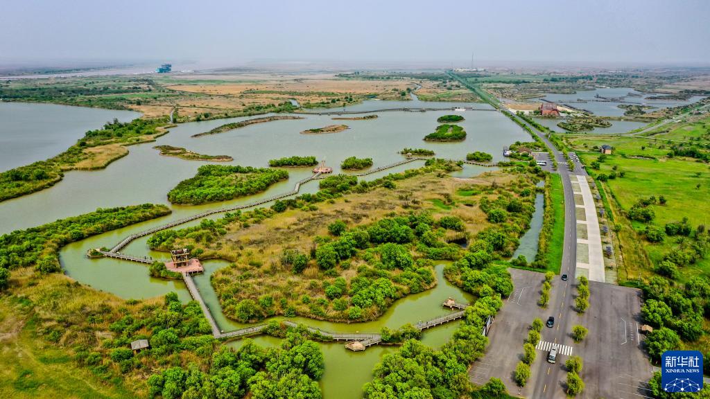 夏日的東營市黃河入??跐竦兀G草連天、百鳥翔集。