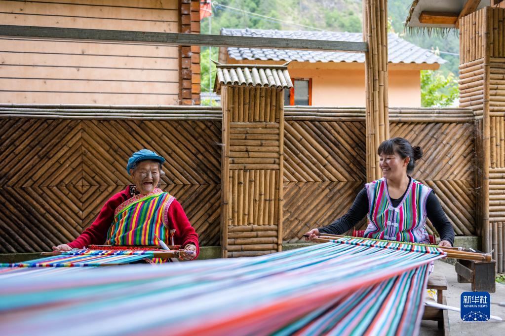 在云南省貢山獨(dú)龍族怒族自治縣獨(dú)龍江鄉(xiāng)迪政當(dāng)村,獨(dú)龍族老人李文仕(左)和女兒在編織獨(dú)龍?zhí)海?月10日攝)。新華社記者 曹夢瑤 攝
