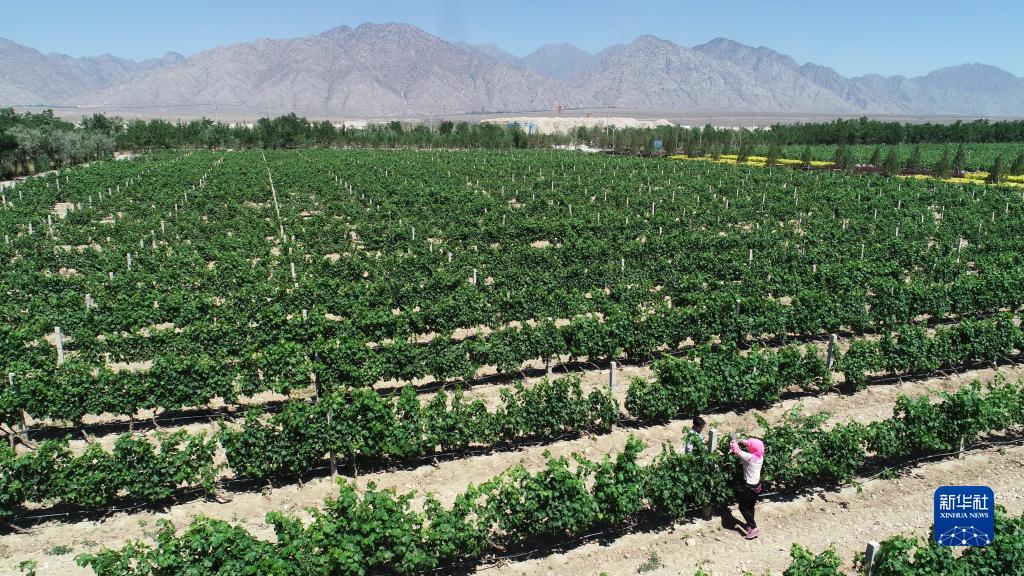 這是位于賀蘭山下的寧夏銀川市沃爾豐酒莊葡萄種植基地(無人機(jī)照片,6月14日攝)。新華社記者 王鵬 攝