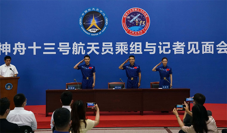 △ 6月28日,神舟十三號航天員乘組在北京航天城與媒體和公眾正式見面,這是他們天外歸來74天后的首次公開亮相。圖為神舟十三號航天員葉光富(左二)、翟志剛(右二)、王亞平(右一)敬禮致意?!⌒氯A社記者 郭中正 攝