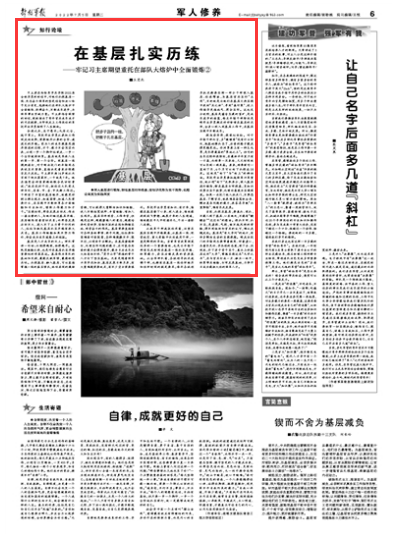 當然,扎根在基層,要真扎、深扎,不能人到了基層、心在他處,不能有“鍍鍍金”“過過水”的想法。根扎不牢、扎不實,是虛根、氣根,經(jīng)不起風雨的考驗,得不到組織和官兵的認可,難以走穩(wěn)走遠?;鶎邮恰坝写髮W問”的地方,有許多鮮活生動的實踐課題。剛走出校門的年輕同志要帶著敬畏、懷著虛心,本著長見識、學本領的態(tài)度,深下去、沉到底,撲下身子苦干實干,真正上好基層這所“大學”,掌握實踐這本“無字之書”,在與官兵打成一片、融為一體中,積累帶兵經(jīng)驗,打牢發(fā)展基礎,力爭早日成為能擔大任的強軍人才。