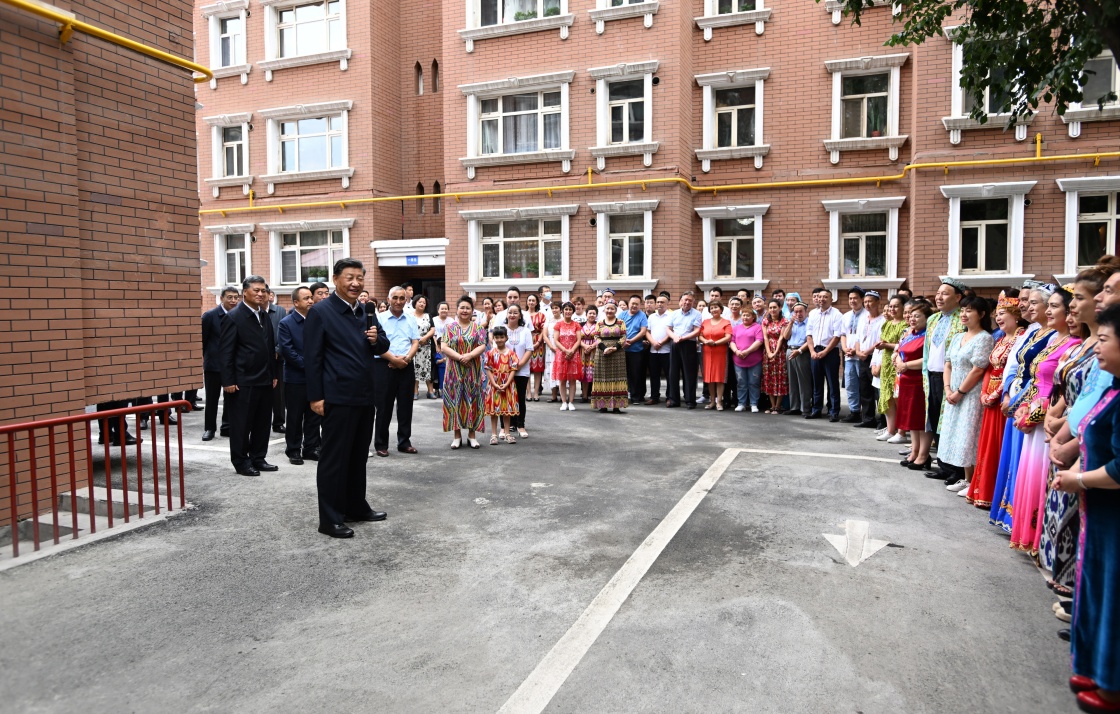 7月12日至15日,中共中央總書記、國(guó)家主席、中央軍委主席習(xí)近平在新疆考察。這是13日上午,習(xí)近平在烏魯木齊市天山區(qū)固原巷社區(qū)考察時(shí),同各族群眾親切交流。新華社記者 謝環(huán)馳 攝