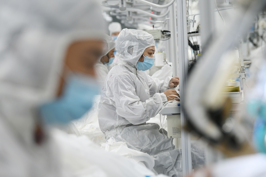 2022年4月27日,福建省福州市倉(cāng)山區(qū)一家民營(yíng)企業(yè)的工人在縫制防護(hù)服。新華社發(fā)(王旺旺攝)