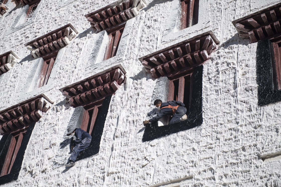2021年10月21日,工作人員進(jìn)行布達(dá)拉宮年度粉刷工作。新華社記者 孫瑞博 攝