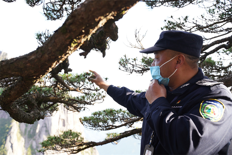 守松的日子里,一年365天,胡曉春有300天要在迎客松前打卡:除了觀察樹皮、梢頭、枝丫、冠頂之外,每天的巡檢細(xì)到連松針都不放過。
