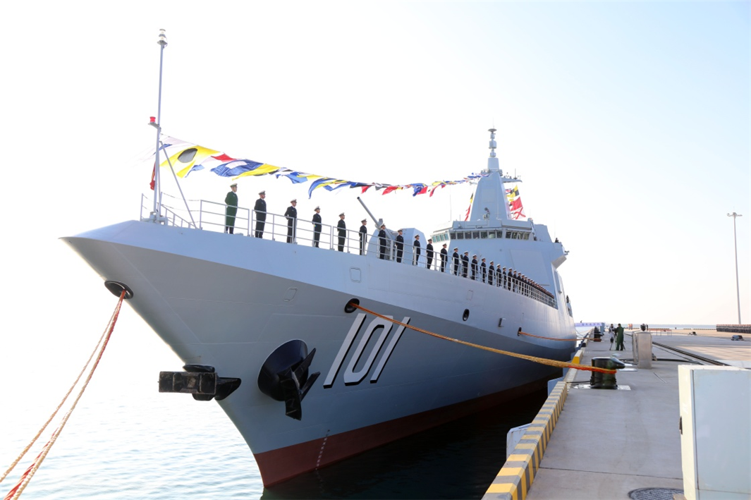 2020年1月12日,中國人民解放軍海軍055型驅(qū)逐艦首艦?zāi)喜灇w建入列儀式在青島某軍港碼頭舉行。新華社記者 李唐 攝