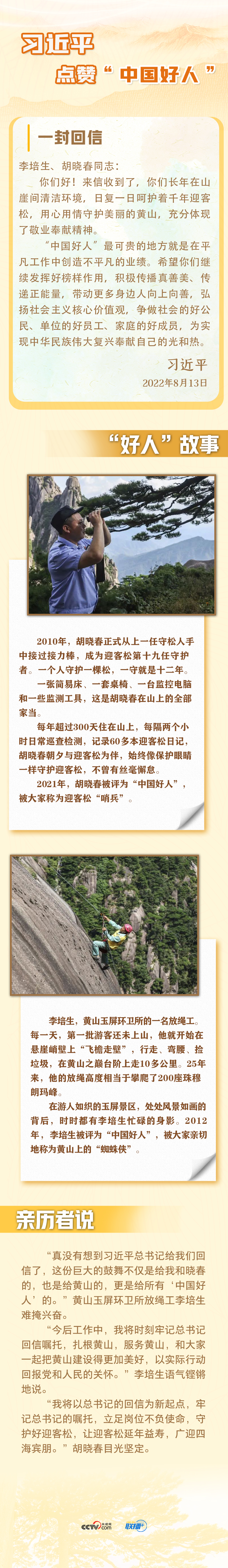 8月13日,習(xí)近平總書記給安徽黃山風(fēng)景區(qū)工作人員李培生、胡曉春回信,對(duì)他們繼續(xù)發(fā)揮“中國(guó)好人”榜樣作用提出殷切期望。