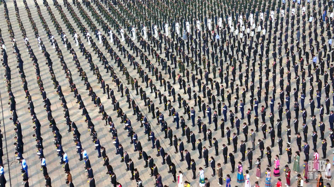 △儀式現(xiàn)場(chǎng),各界代表依次走到紀(jì)念碑前,獻(xiàn)上手中鮮花。(總臺(tái)央視記者閆耀東、國(guó)廣記者李晉拍攝)