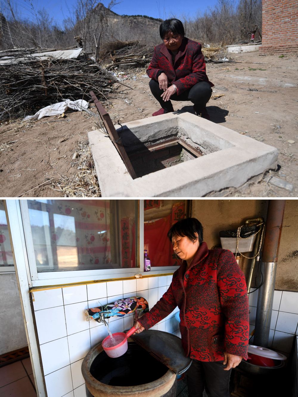 ↑拼版照片上圖:河北省平泉市楊樹嶺鎮(zhèn)五道梁子村村民李秀芝在曾經(jīng)用過的雨水窖旁;下圖:李秀芝在家中使用自來水(2020年4月2日攝)。