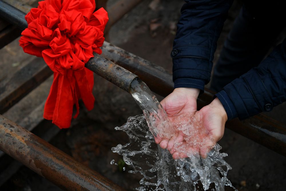 ↑2019年11月20日,在山西省臨汾市翼城縣南梁鎮(zhèn)南嶺村打井工程竣工儀式現(xiàn)場,一名村民用手捧著井下抽上來的水。從這一天起,這個(gè)百年“旱井村”有了自己的深水井。