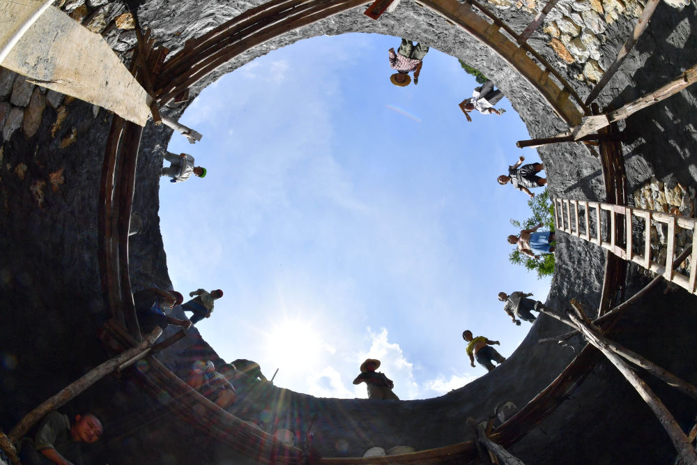 ↑2017年9月2日,在廣西大化瑤族自治縣板升鄉(xiāng)弄勇村,人們在修建家庭水柜。廣西因地制宜,加快實(shí)施農(nóng)村飲水安全鞏固提升工程。采取新建、擴(kuò)建及管網(wǎng)延伸等多種措施,補(bǔ)齊貧困地區(qū)水利薄弱短板,進(jìn)一步提升石漠化地區(qū)群眾飲水安全保障水平。
