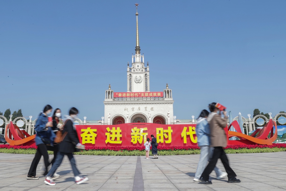 人們在“奮進新時代”主題成就展室外展區(qū)參觀(2022年10月6日攝)。新華社記者 張玉薇 攝
