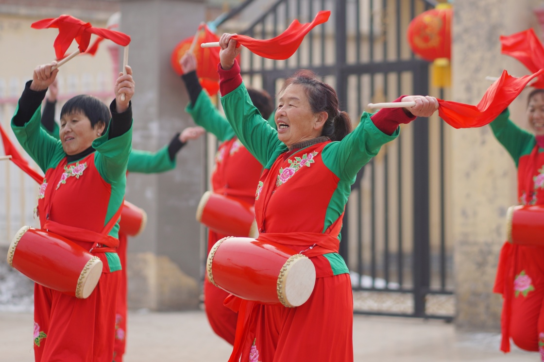 河北省邢臺市內丘縣史村屯村村民在廣場排練腰鼓(2022年1月29日攝)。新華社發(fā)(劉繼東 攝)