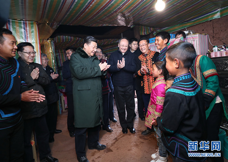 2018年2月10日至13日,中華民族傳統(tǒng)節(jié)日農(nóng)歷春節(jié)來(lái)臨之際,中共中央總書(shū)記、國(guó)家主席、中央軍委主席習(xí)近平來(lái)到四川考察調(diào)研,看望慰問(wèn)各族干部群眾,向全國(guó)各族人民致以美好的新春祝福。這是2月11日上午,習(xí)近平在涼山彝族自治州昭覺(jué)縣三岔河鄉(xiāng)三河村貧困戶吉好也求家中看望,聽(tīng)10歲小女孩吉好有果唱《國(guó)旗國(guó)旗真美麗》。新華社記者 鞠鵬/攝