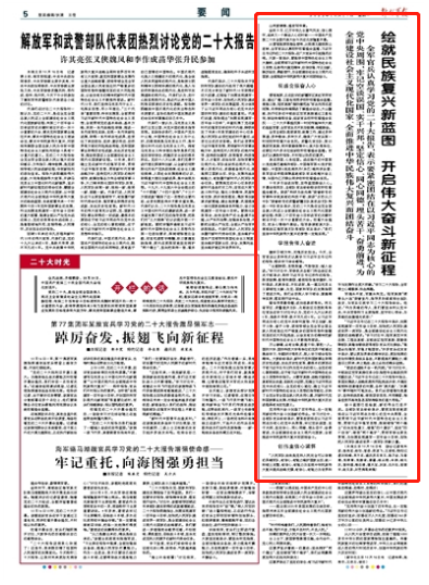 從雪域高原到海島前哨,從荒漠戈壁到深山密林,全軍官兵認(rèn)真收聽(tīng)收看盛會(huì)直播,習(xí)近平總書(shū)記作的二十大報(bào)告,在廣大官兵中引起強(qiáng)烈反響。大家一致表示,要高舉中國(guó)特色社會(huì)主義偉大旗幟,全面貫徹習(xí)近平新時(shí)代中國(guó)特色社會(huì)主義思想,弘揚(yáng)偉大建黨精神,自信自強(qiáng)、守正創(chuàng)新,踔厲奮發(fā)、勇毅前行,為全面建設(shè)社會(huì)主義現(xiàn)代化國(guó)家、全面推進(jìn)中華民族偉大復(fù)興而團(tuán)結(jié)奮斗。